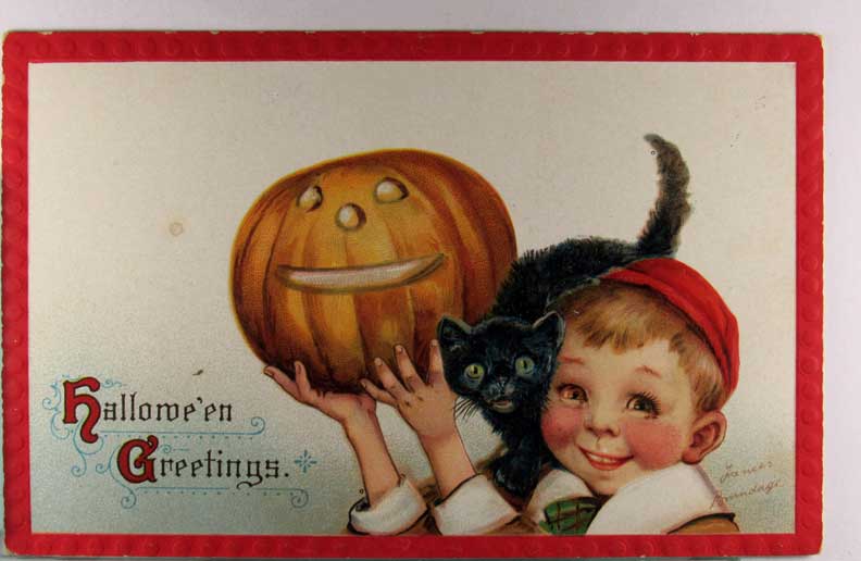 Lot #575. View Larger | Rotate Halloween, John Winch cpr. 1913, “Halloween Pumpkins” DB emb one very m cor cr near VF