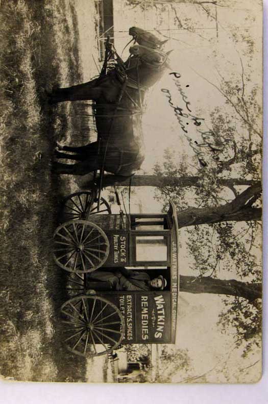 Lot #1458. View Larger | Rotate Horse-Drawn Wagon Adv. Watkins Remedies, Real Photo, Used Minnesota 1911 cor wear & m wof Near F-VF
