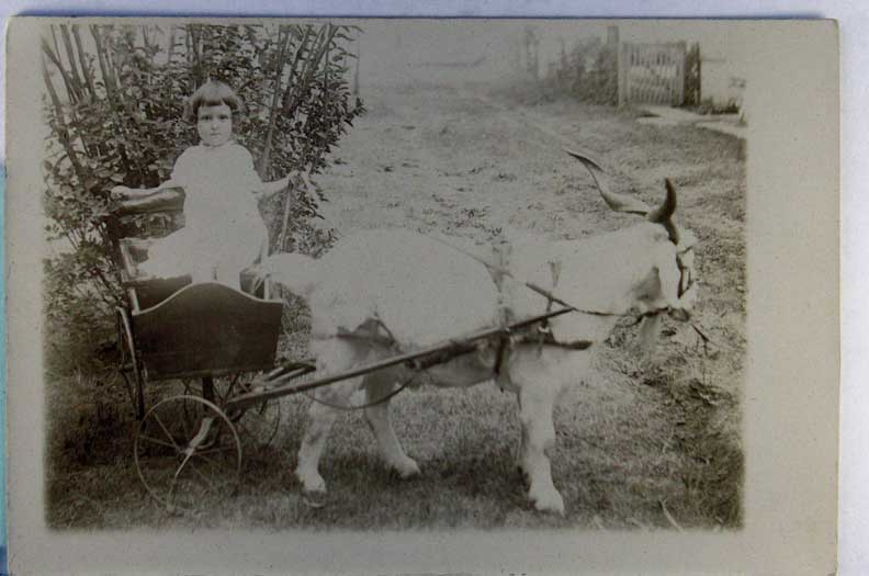 Lot #1473. View Larger | Rotate Cow-Pulled Wagon, Real Photo w/ Kruxo P.C. back, “Oshkosh, Wisconsin or Bust” VF