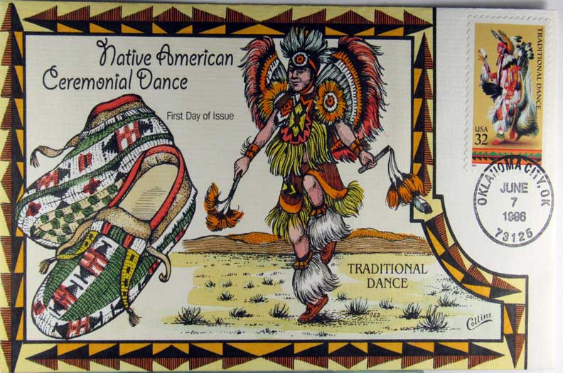 Lot #840. View Larger | Rotate Hand-Painted First Day Cover by Collins, “Native American Ceremonial Dance”, 1996 VF