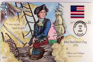 Lot #1065. View Larger | Rotate Hand-Painted First Day Cover by Collins, “John Paul Jones Flag”, 2000 VF