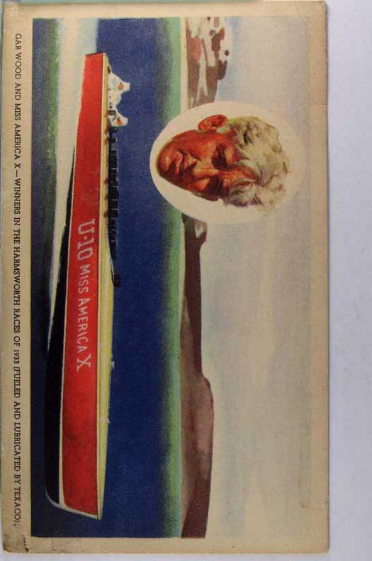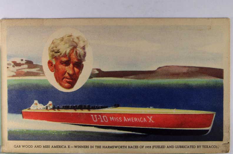 Lot #1257. View Larger | Rotate Gar Wood and Miss America X - Racing Boat Art Card, 1933 Texaco Adv. cor crs & m ink Near F-VF