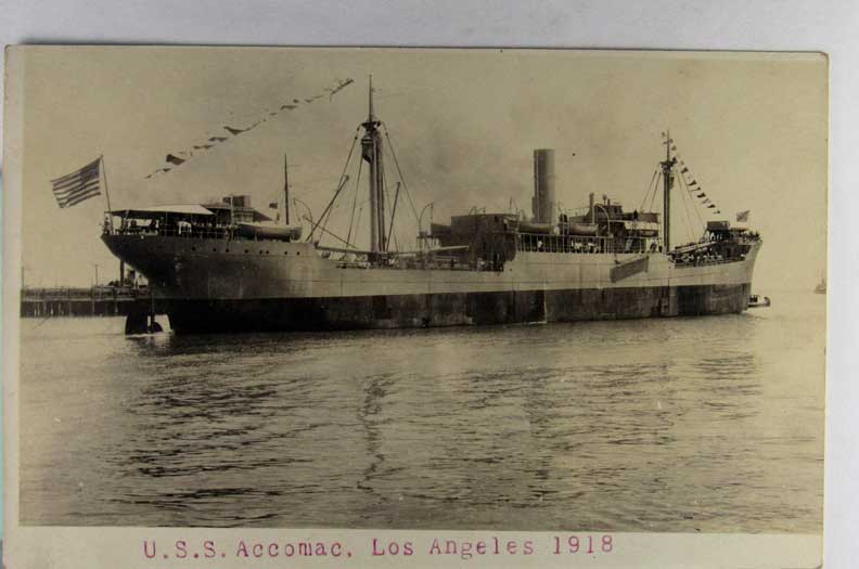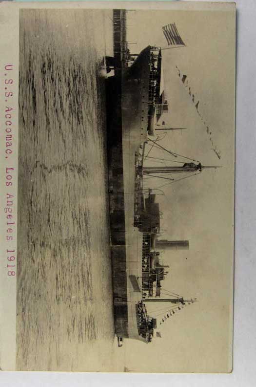 Lot #1241. View Larger | Rotate U.S.S. Accomac, Real Photo w/ AZO P.C. back, “Los Angeles 1918” m cor wear & m cor cr F-VF