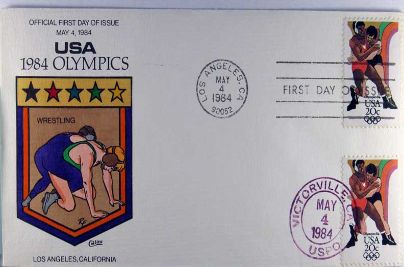 Lot #1042. View Larger | Rotate Hand-Painted First Day Cover by Collins, 1984 Olympics, “Wrestling”, 1984 VF
