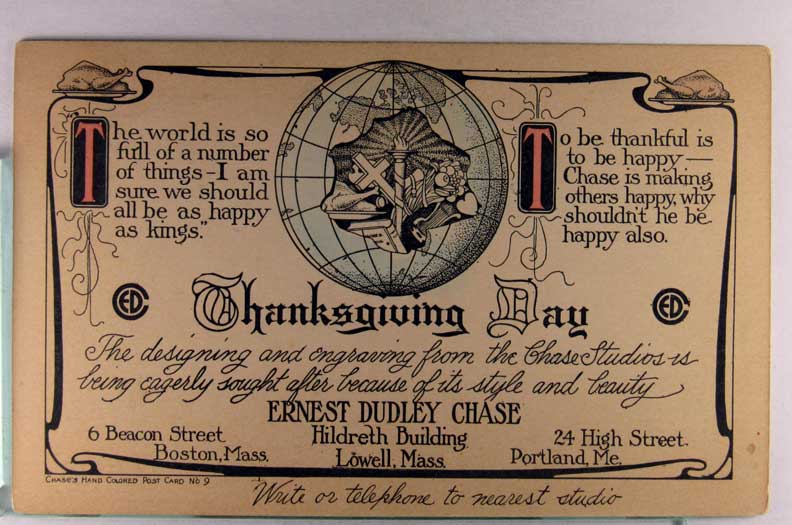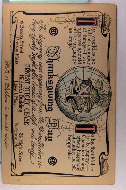 Lot #1086. View Larger | Rotate Adv. Ernest Dudley Chase Designing & Engraving (Postcards) w/Thanksgiving Message UB m cor wear Near VF