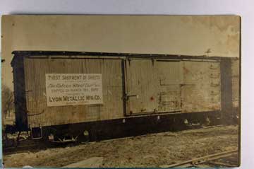 Lot #1471. View Larger | Rotate Train Car Adv. Lyon Metallic Mfg. Co., Aurora, Illinois, Real Photo w/ AZO P.C. back sts Near F-VF