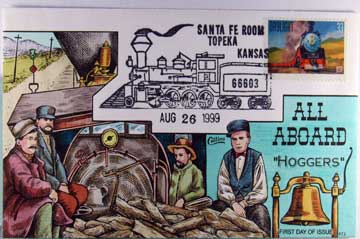 Lot #1478. View Larger | Rotate Hand-Painted First Day Cover by Collins, “All Aboard Hoggers”, 1999 VF