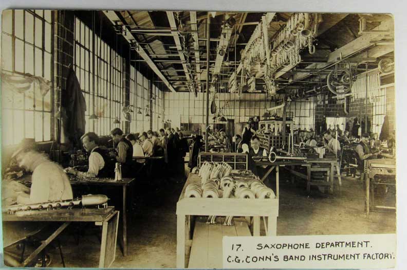 Lot #1525. View Larger | Rotate Indiana, Elkhart, C.G. Con Musical Instrument Factory, Saxophone Dept., Real Photo w/ AZO P.C. back m cor wear & m cor cr F-VF