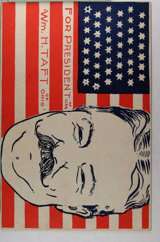 Lot #926. View Larger | Rotate Wm. Taft For President, Portrait w/ U.S. Flag, used Nov, 1908 cr & m cor wear F-VF