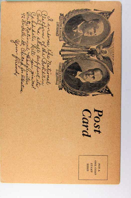 Lot #933. View Larger | Rotate Prohibition Party Candidates, Eugene Chafin and Aaron Watkins, Portraits on Stamp Side, Platform on Front DB m cor wear Near VF