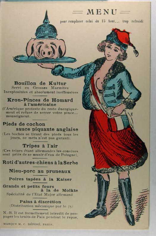 Lot #1120. View Larger | Rotate W.W. I, French Pub., w/ Kaiser Wilhelm as Pig., Menu Card DB VF