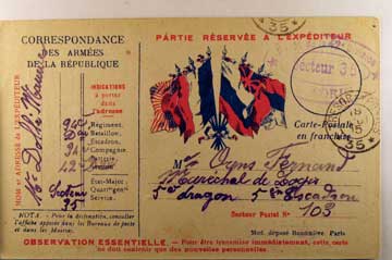 Lot #1116. View Larger | Rotate W.W. I French Soldier’s Use Postcard w/ Color Flags, used 1915 w/ Military Cancel F-VF