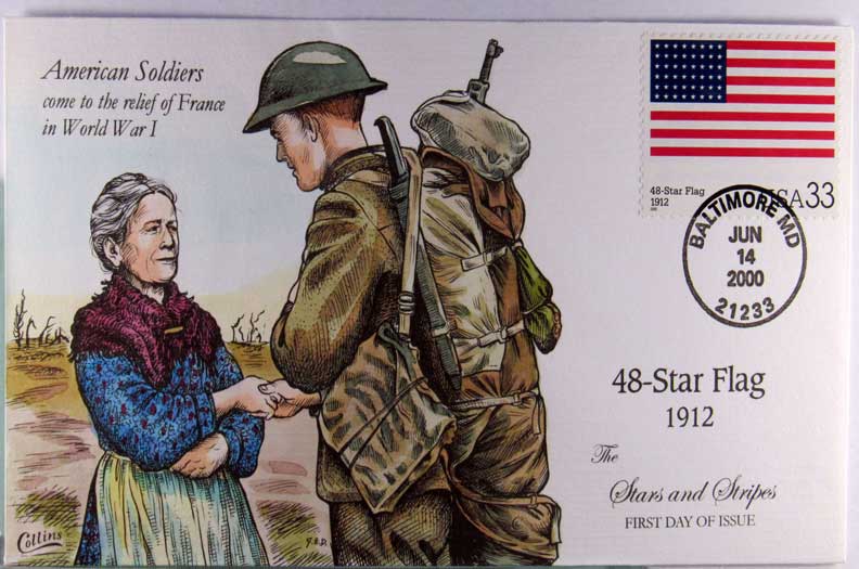 Lot #1113. View Larger | Rotate Hand-Painted First Day Cover by Collins, “American Soldiers Come to the Relief of France...”, 2000 VF