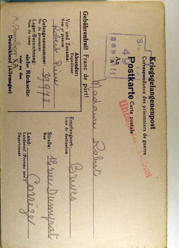 Lot #1035. View Larger | Rotate W.W. II POW Letter Sheet, German “Stalag X A” Cover from Prisoner 39973 to France m cor wear F-VF