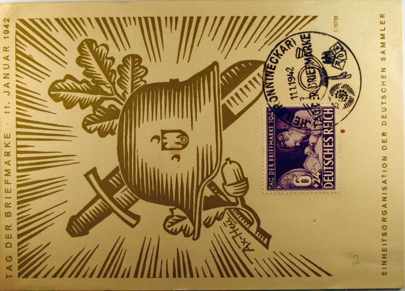 Lot #1037. View Larger | Rotate W.W. II German Patriotic Tag Der Briefmarke Postcard, used 1942 w/ Stamp and Special CTO Cancel m cor cr near F-VF