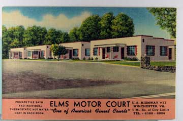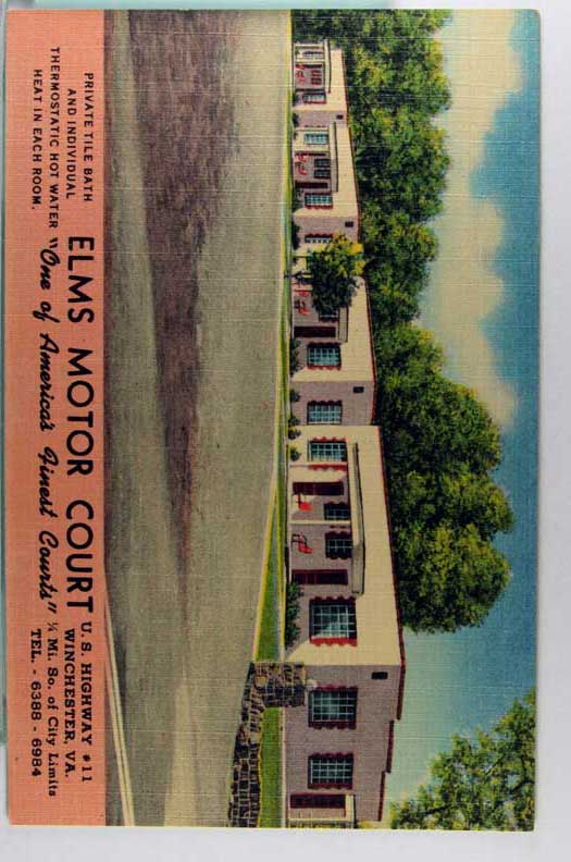 Card # 180765. View Larger | Rotate Adv. Elms Motor Court, Winschester, Virginia, Curt Teich Pub. L VF