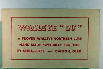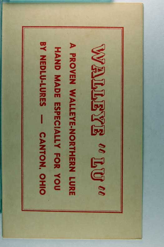 Card # 180783. View Larger | Rotate Adv. Walleye “LU” Lures by Nedlu-Lures, Canton, Ohio, “Use w/ Crawler or Pork Rind” w/Non P.C. back VF