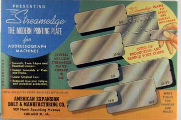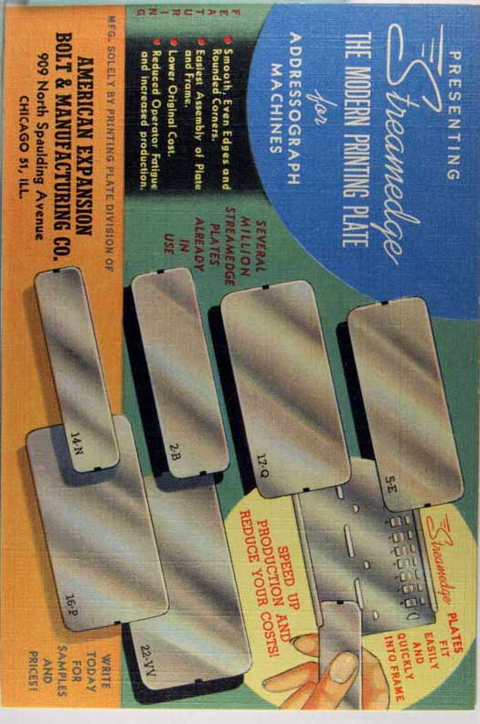 Card # 166987. View Larger | Rotate Adv. Streamedge Printing Plates for Addressograph Machines, Chicago, Illinois L VF