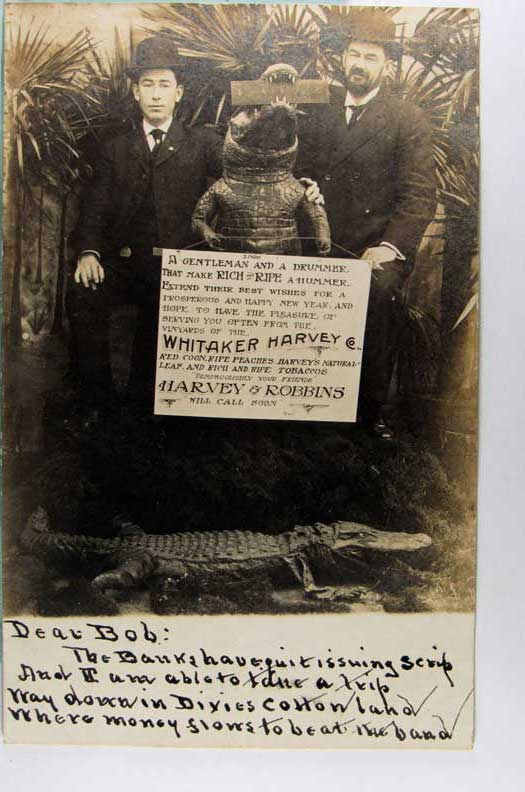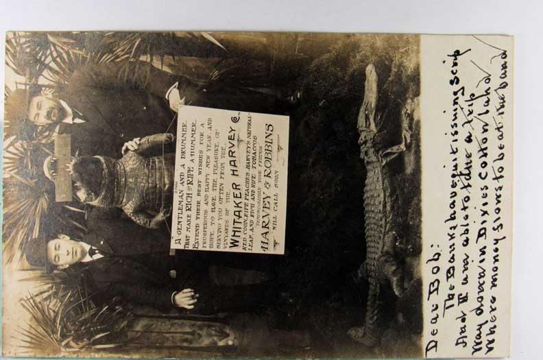 Card # 168404. View Larger | Rotate Adv. Whitaker Harvey Co. Red Coon Tobacco, Arcade Style Real Photo w/ Taxidermy Aligators, Used Winston-Salem, North Carolina wof VF