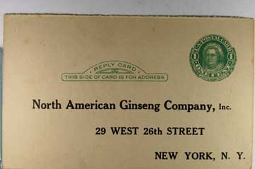 Card # 142778. View Larger | Rotate Adv. North Amercian Ginseng Co. on U.S. Gov’t Postal, New York City m cor wear Near VF