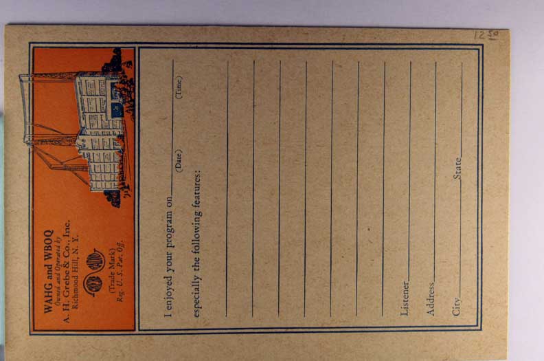 Card # 130951. View Larger | Rotate Adv. WAHG & WBOQ Radio w/ Synchrophase Radio Adv. on back very m wof VF