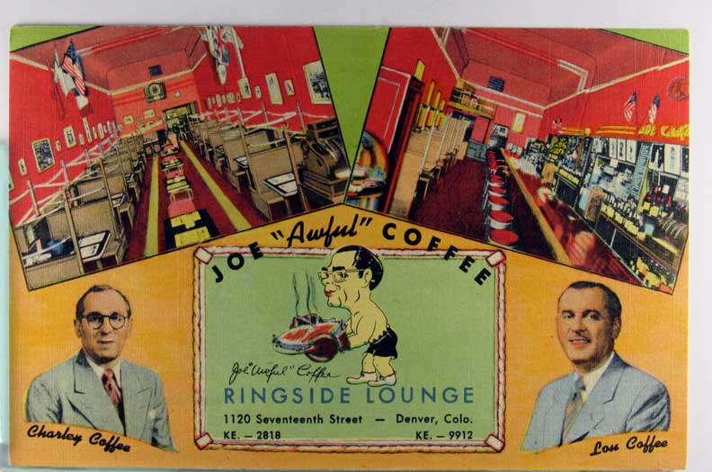 Card # 183535. View Larger | Rotate Adv. Ringside Lounge, Denver, Colorado w/ Joe “Awful” Coffee, Curt Teich pub. L VF