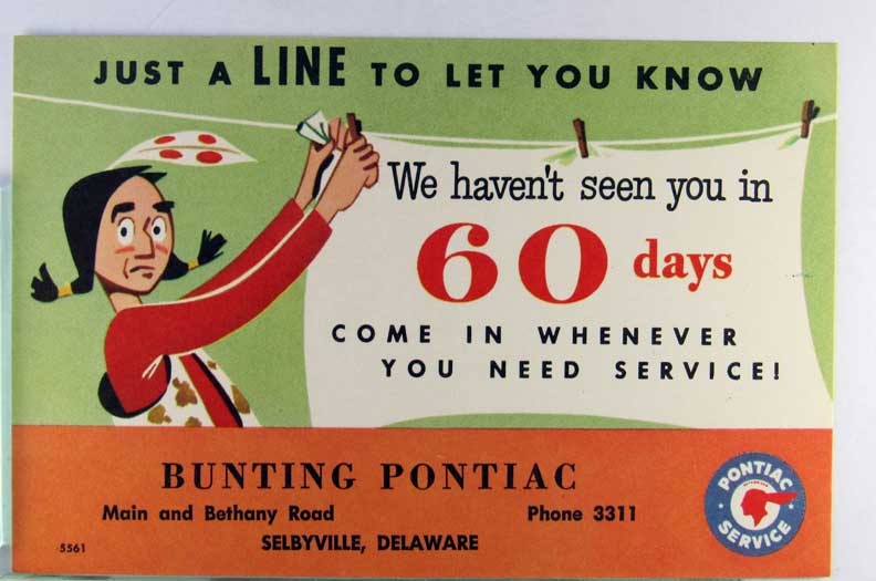 Card # 155307. View Larger | Rotate Adv. Bunting Pontiac Service Center, Selbyville, Delaware, w/ Native America on Non P.C. back VF
