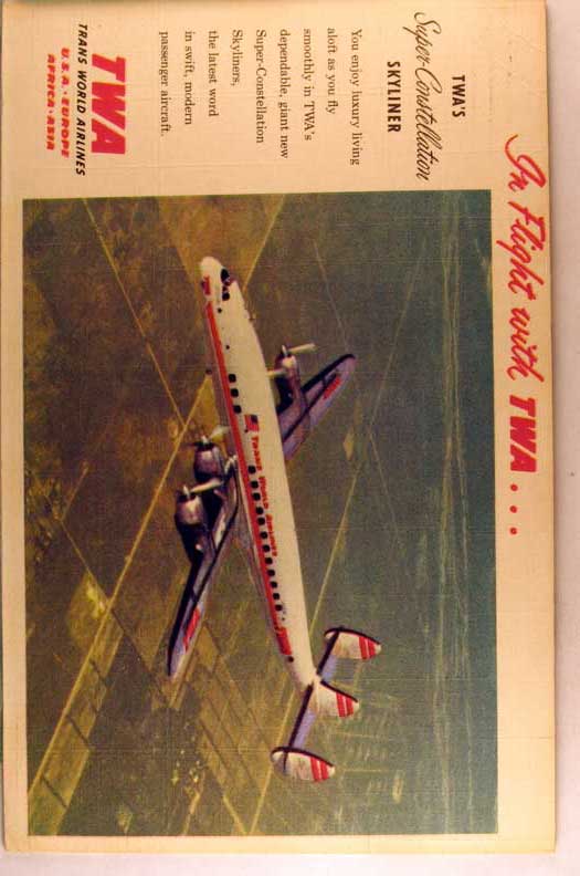 Card # 51385. View Larger | Rotate Adv. Trans World Airlines, Constellation in Flight L VF