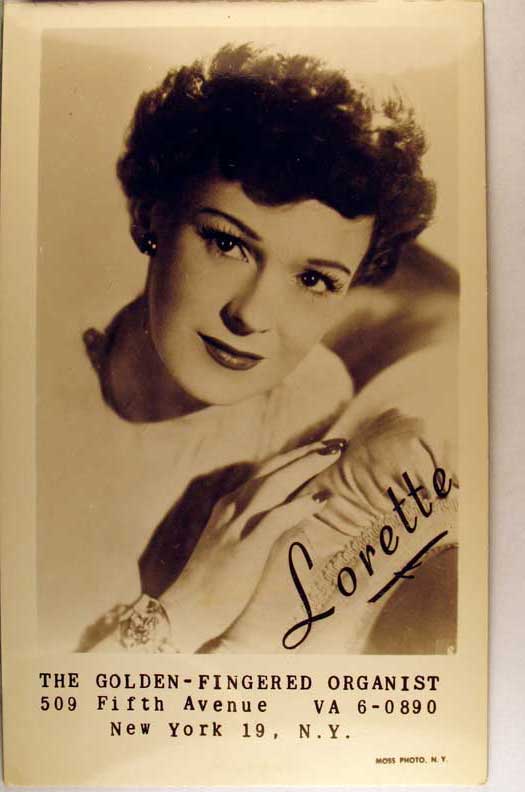 Card # 9895. View Larger | Rotate B&W Photo, Adv. “The Golden Fingered Organist”, Loretta, New York City VF