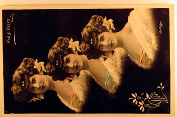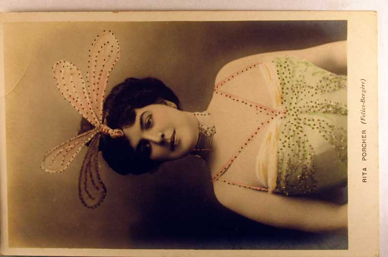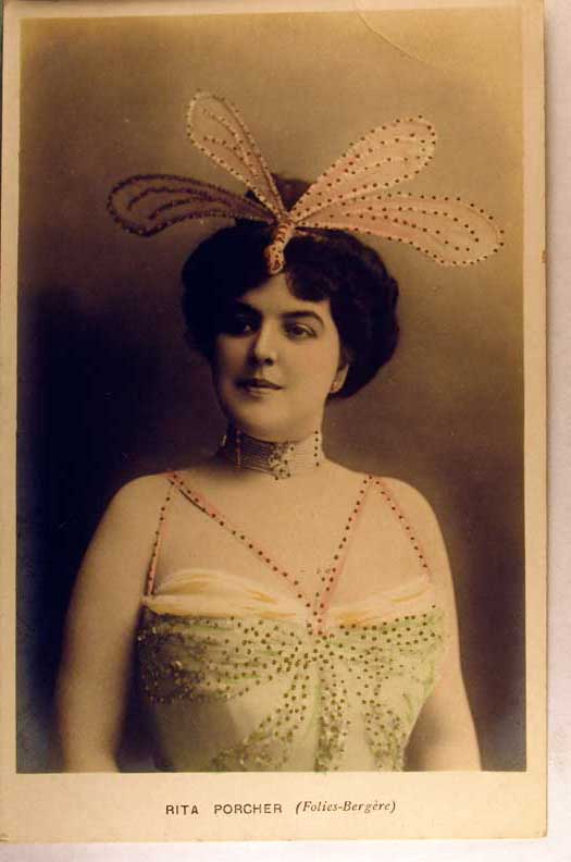 Card # 40646. View Larger | Rotate Rita Porcher, Tinted Real Photo, French Pub., “Folies-Bergere”, Floral Hat UB edge crs F-VF