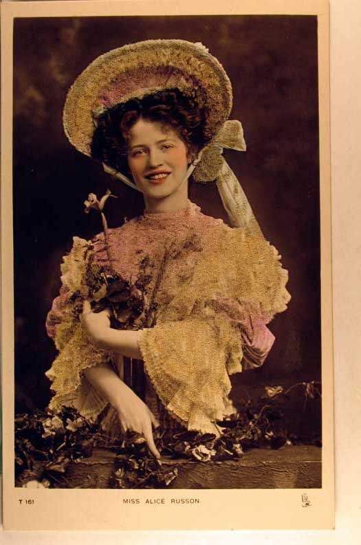 Card # 42999. View Larger | Rotate Miss Alice Russon, Raphael Tuck pub. Celebrities Of The Stage ser., Tinted Real Photo w/ Tiny Beads Add On, very nice DB VF
