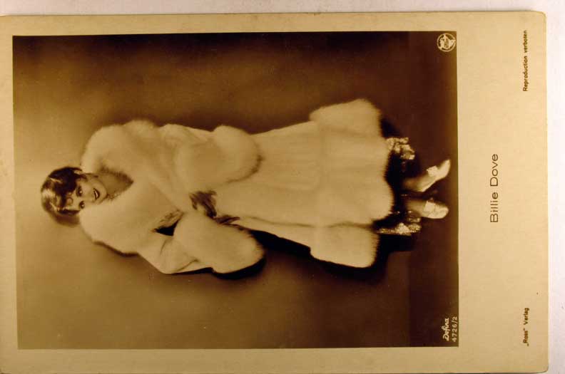 Card # 21558. View Larger | Rotate German B&W Photo, “Billie Dove”, in White Fur Coat DB m cor wear F-VF