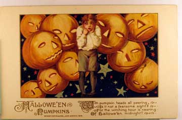 Card # 61389. View Larger | Rotate Halloween, John Winch cpr. 1913, “Halloween Pumpkins” DB emb one very m cor cr near VF