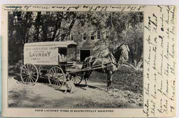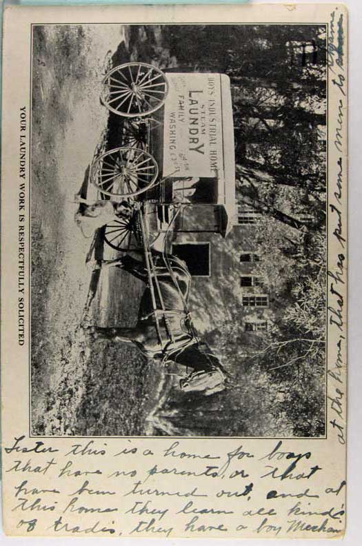 Card # 195006. View Larger | Rotate Horse-Drawn Wagon Adv. Boy’s Indusrial Home Steam Laundry, Printed Photo, Used 1911 wof & edge tear F
