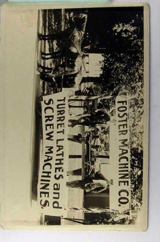 Card # 135112. View Larger | Rotate Horse-Drawn Parade Float Adv. “Foster Machine Co.”, Incl. Lathe, Real Photo w/ Kruxo P.C. back cor wear Near F-VF