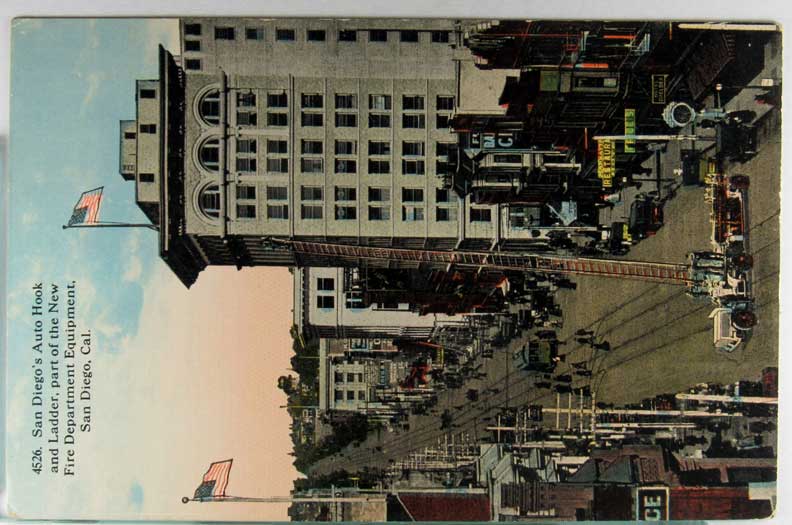 Card # 164260. View Larger | Rotate Firefighting Auto, Tinted Printed Photo, “Auto Hook & Ladder”, San Diego, California DB m cor wear F-VF