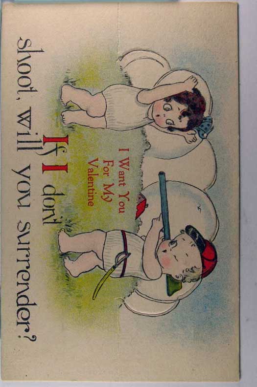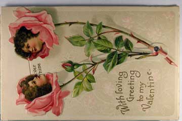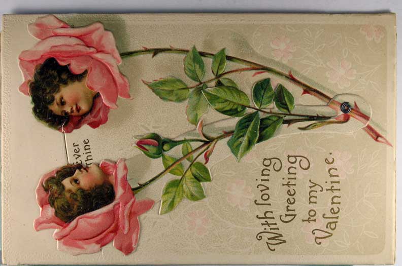 Card # 114496. View Larger | Rotate Novelty Mechanical, Int. Art Pub. Co., Art by Clapsaddle, Valentine, Kissing Flower Faces DB emb Near VF