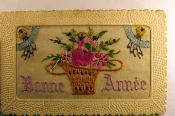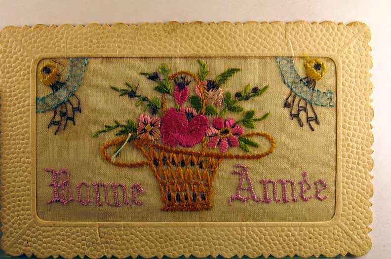 Card # 89764. View Larger | Rotate Novelty Embroidered Silk, French Pub., New Year DB m edge crs F-VF