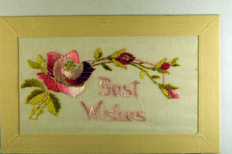 Card # 23642. View Larger | Rotate Embroidered Silk, “Best Wishes”, Quality Card DB some edge creases F-VF