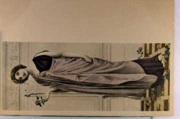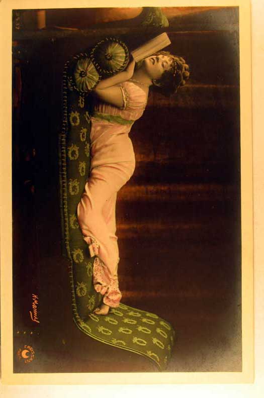 Card # 21589. View Larger | Rotate French Tinted Photo by Manuel, Croissant Pub. #3537, Lady on Great Couch, Beautiful Card DB VF