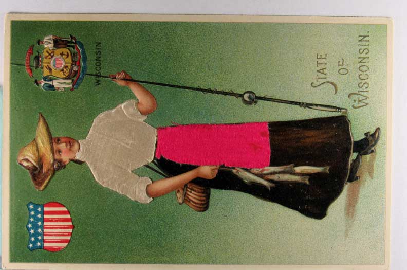Card # 169457. View Larger | Rotate State Ladies ser. w/ Novelty Silk Add-On, “Wisconsin” DB DB emb VF