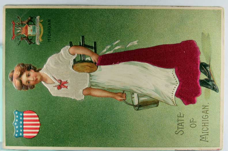 Card # 160043. View Larger | Rotate State Ladies Ser. w/ Novelty Silk Add On, “Michigan”, Langsdorf Pub. DB emb m cor wear Near VF