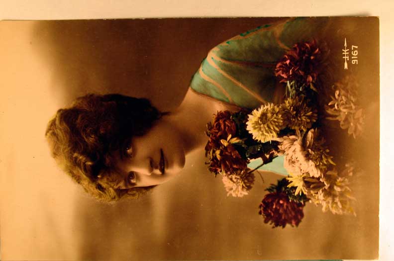 Card # 241. View Larger | Rotate Hand Tinted photo, Lady with Flowers, very nice DB VF