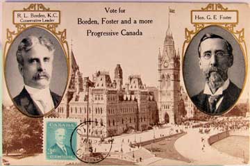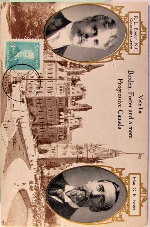 Card # 147355. View Larger | Rotate Canadian Political, “Vote for Borden & Foster for More Progressive Canada”, Printed Photo DB m cof & stamp on face Near F-VF