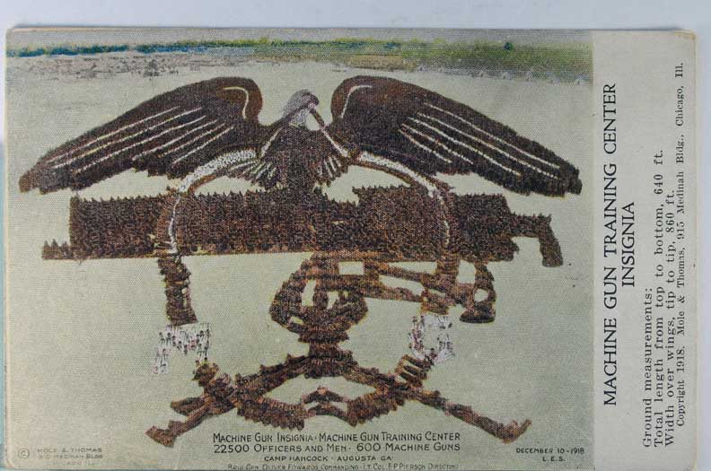Card # 124450. View Larger | Rotate U.S. Patriotic, Tinted Printed Photo, Camp Hancock, Georgia, “Machine Gun Insignia - 22500 Officers & Men”, cpr. Mole & Thomas DB cor wear & crs Near F-VF