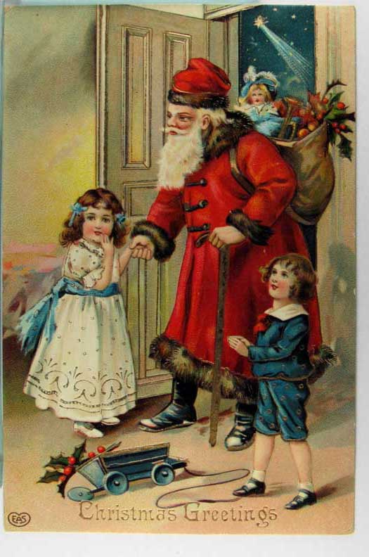 Card # 170780. View Larger | Rotate Red Suited Santa, Art. Sig. Ellen Clapsaddle, Int. Art Pub. Co., Used 1907 DB emb cof & small hole F
