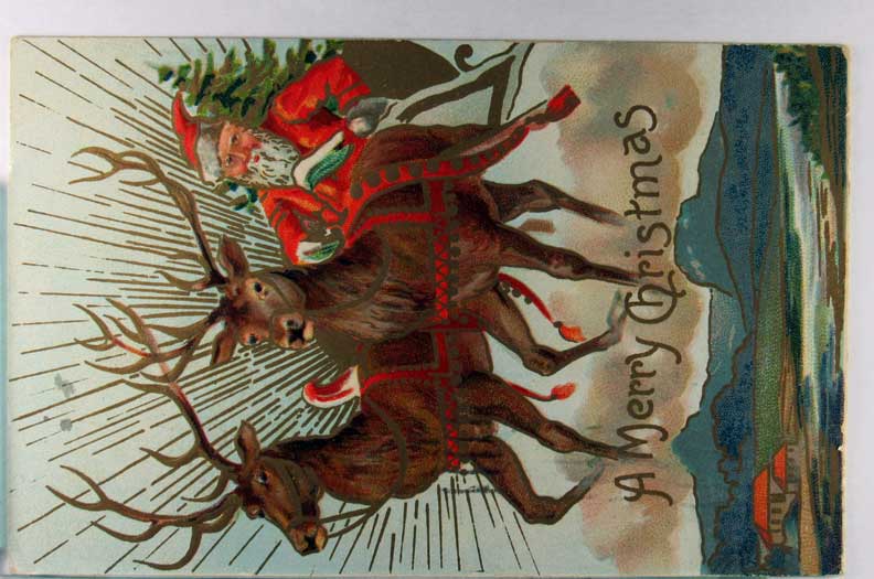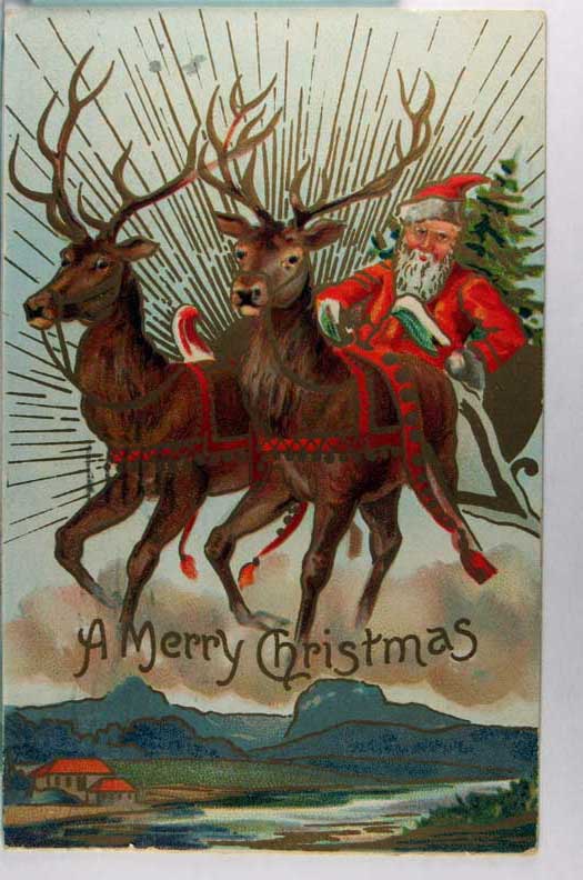 Card # 110197. View Larger | Rotate Red Suited Santa w/ Reindeer & Gold Ink, Whitney Pub. DB emb VF