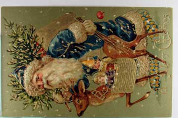 Card # 161974. View Larger | Rotate Blue Suited Santa w/ Deer, German Pub., Used DB debossed VF