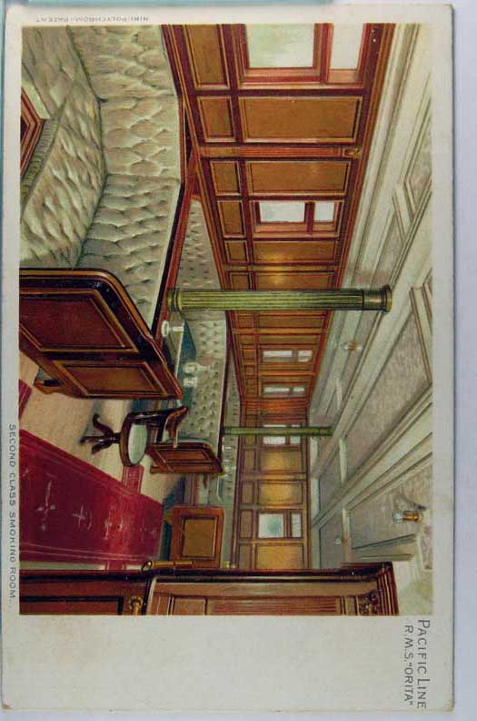Card # 124373. View Larger | Rotate Adv. PSNC Pacific Line, RMS Orita Interior, “Second Class Smoking Room” DB m cor wear F-VF