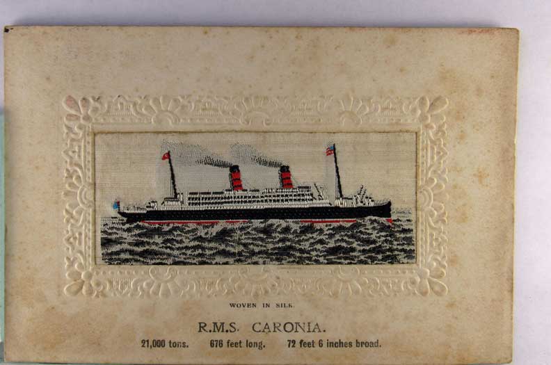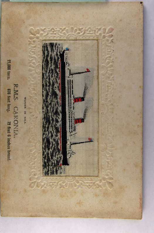 Card # 154745. View Larger | Rotate Woven Silk, RMS Caronia, Used 1908 DB foxing Near F-VF